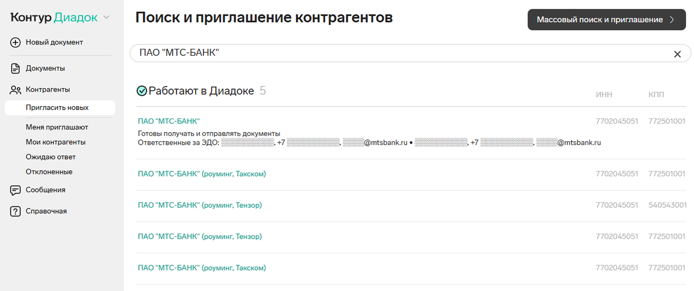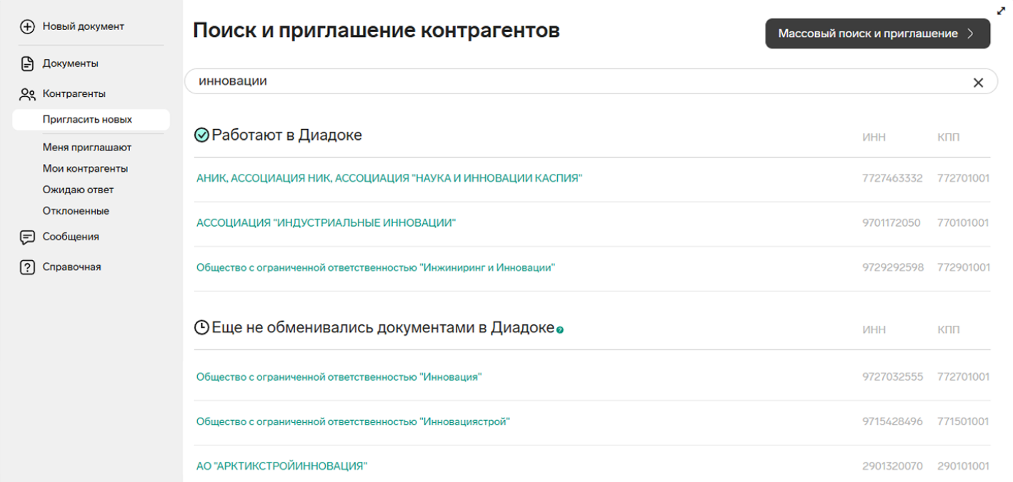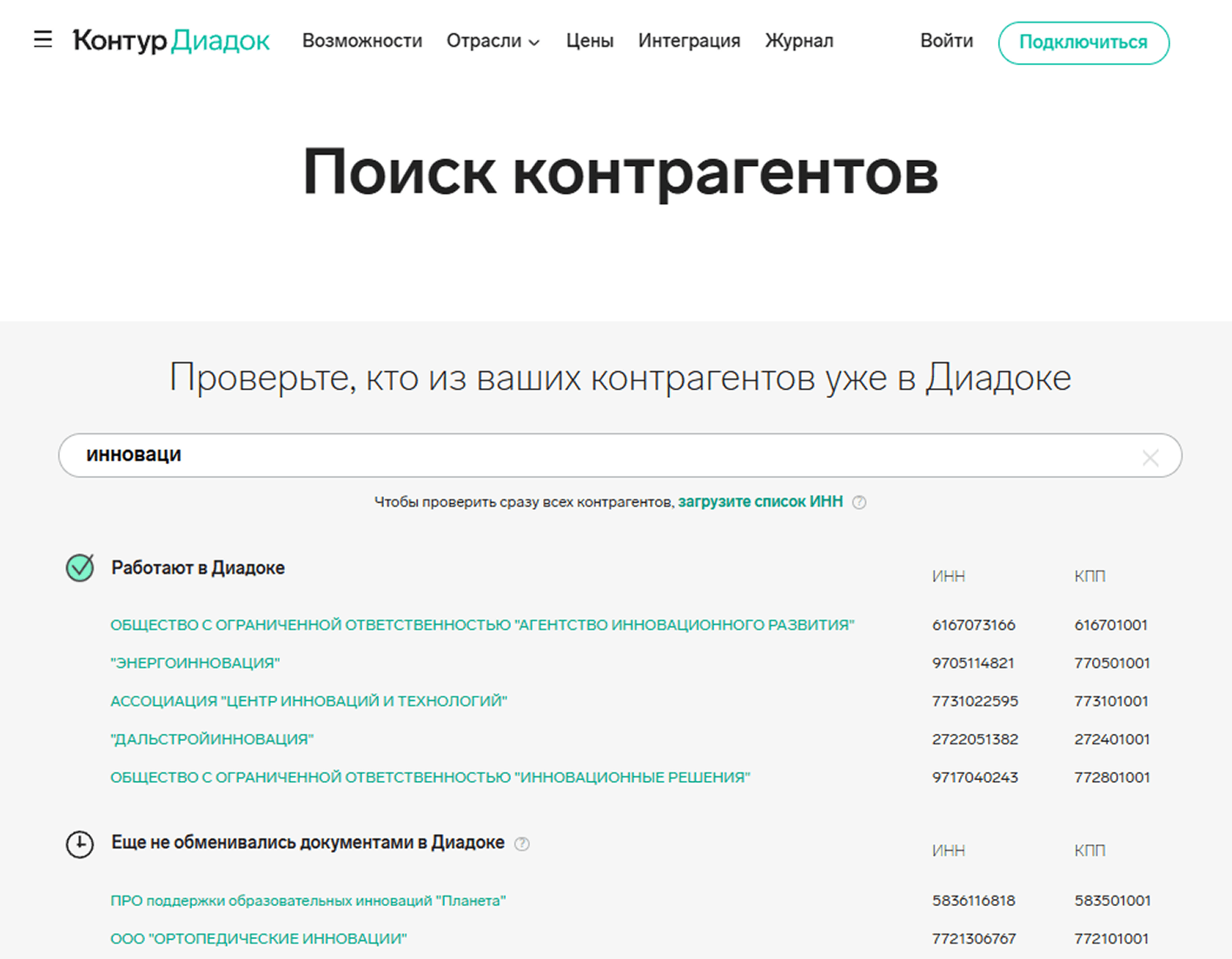 Чтобы проверить, есть ли ваши контрагенты в Диадоке, воспользуйтесь поиском по ИНН.