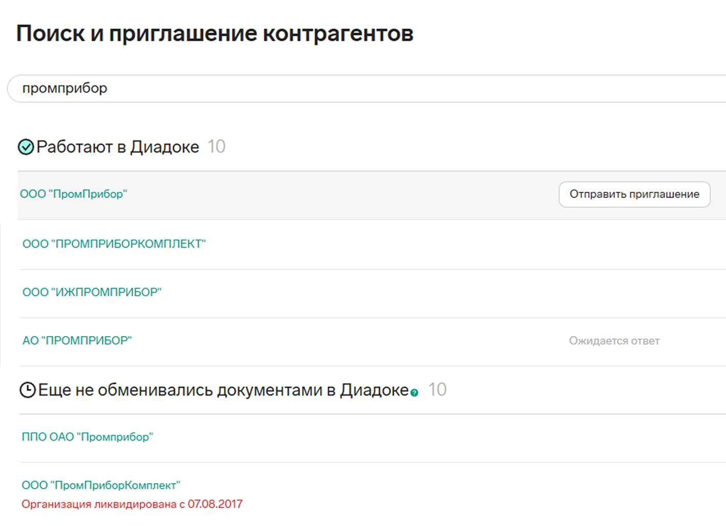 Чтобы пригласить компанию обмениваться документами через Диадок, напротив нужной компании нужно нажать «Отправить приглашение».