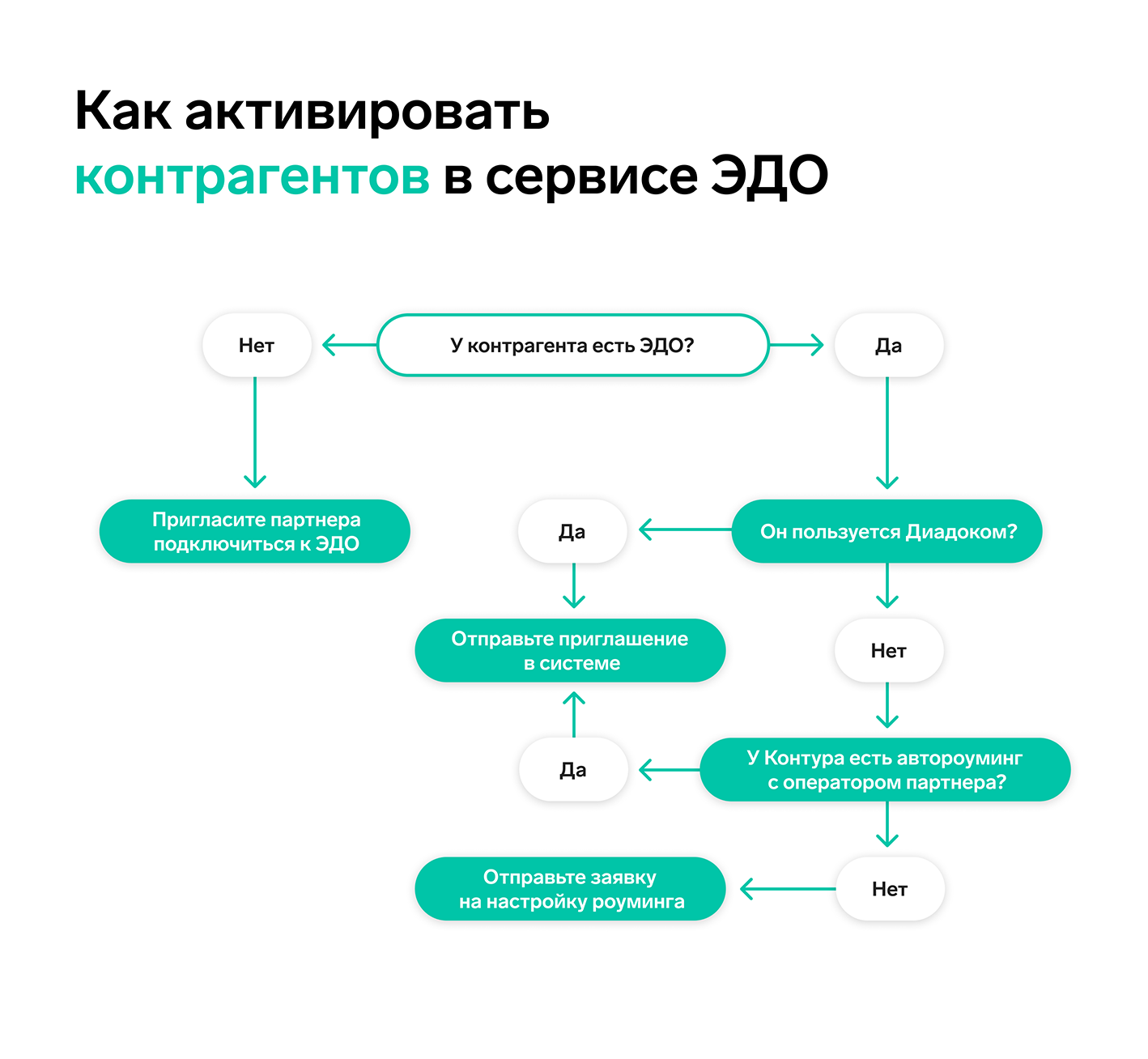 Если у партнера нет личного кабинета в сервисе ЭДО, он не сможет увидеть и подписать документы. Поэтому следующий шаг после подключения к сервису ― проинформировать контрагентов о переходе на электронный документооборот и начать обмен. Есть три сценария: