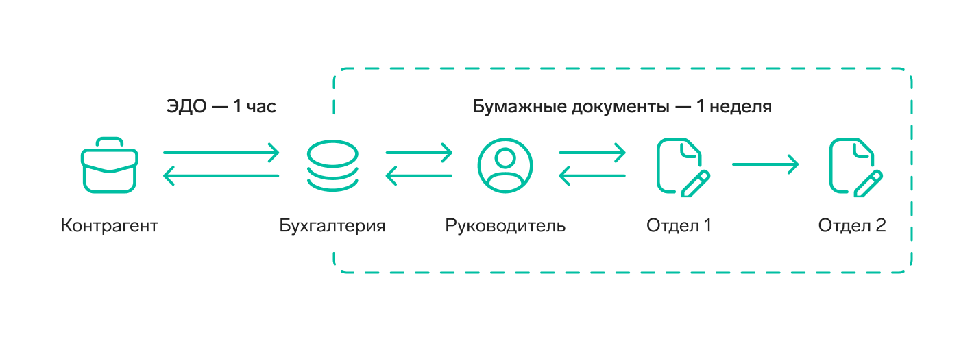 Онлайн-документооборот помогает вести бухгалтерский учет и ускорять движение документа. Например, чтобы заключить договор с нестандартными условиями, менеджер отдела продаж должен согласовать документ с руководителем и юрслужбой перед отправкой клиенту. В тех организациях, где используют электронный документооборот (ЭДО), этот процесс занимает меньше часа.