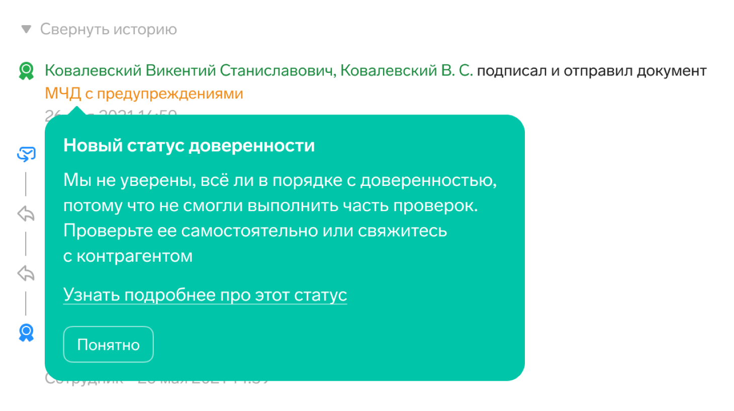 Если МЧД контрагента прошла проверку с предупреждением, на странице документа пользователь увидит всплывающее сообщение о новом статусе доверенности.