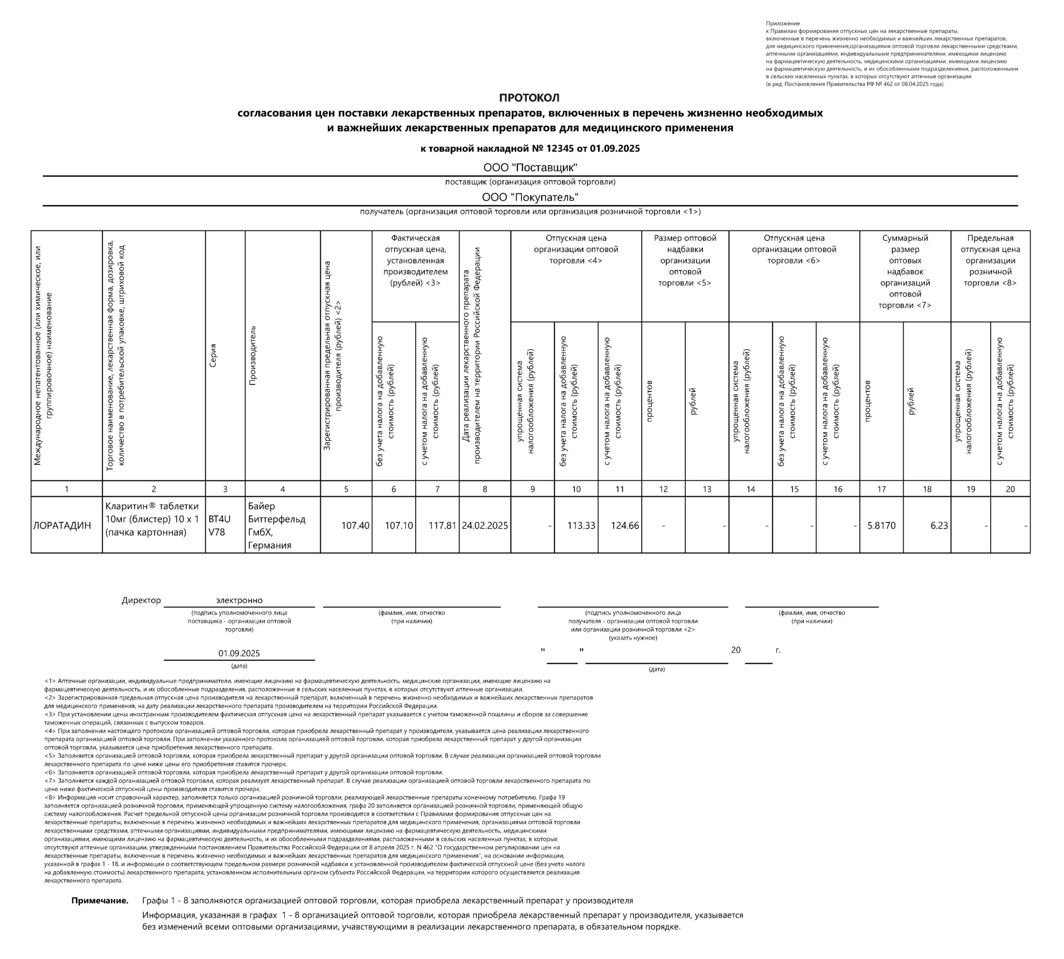 Протокол согласования цен ― это документ, который формируется при поставке лекарственных препаратов, включенных в перечень жизненно необходимых и важнейших. В протоколе фиксируются фактические отпускные цены производителей и оптовые и розничные надбавки к ним. Без протокола реализация препаратов из данного списка невозможна.