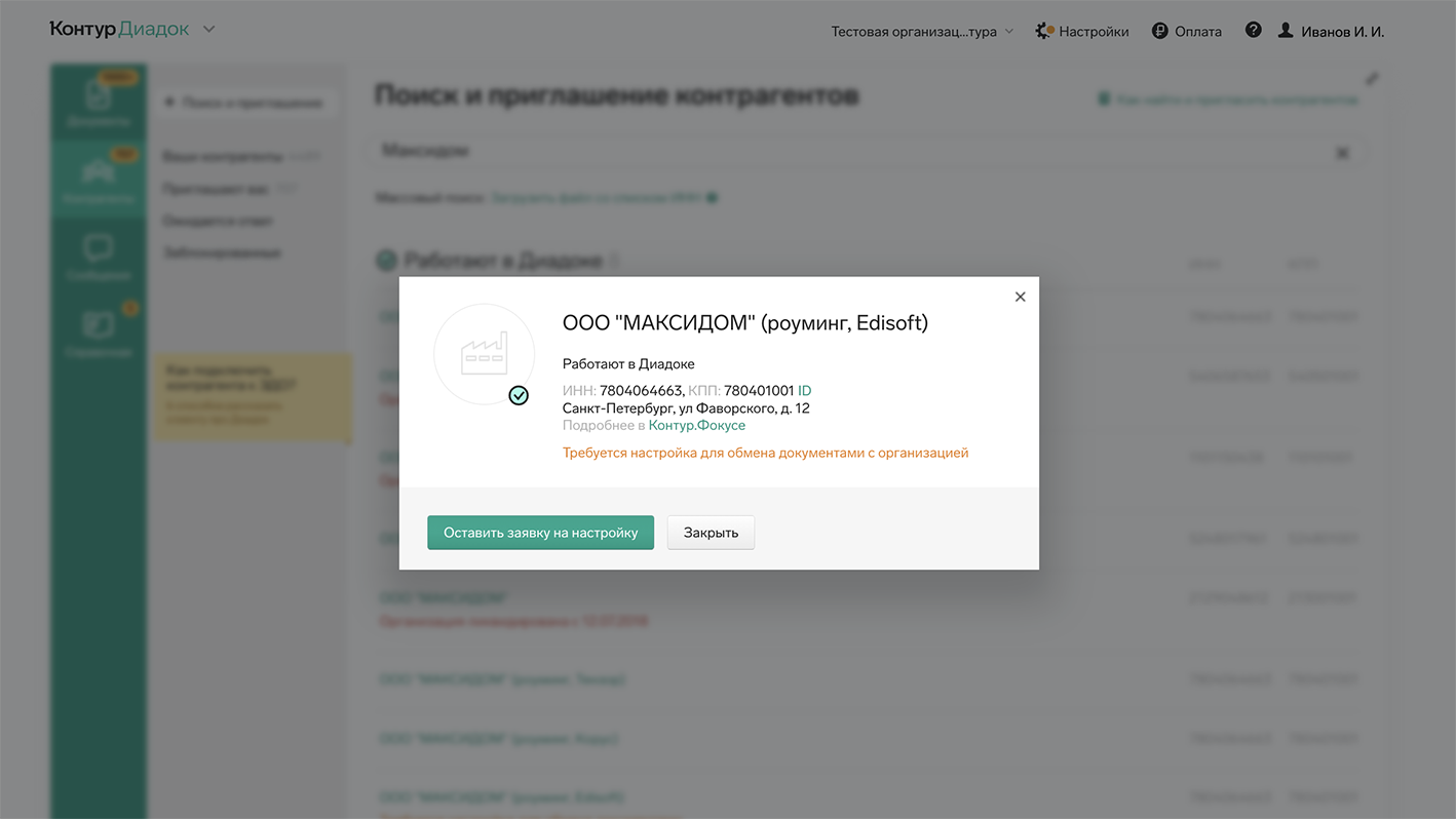 В случае с Ediweb система сообщит, что требуется настройка для обмена документами с организацией. Для отправки заявки следует нажать кнопку «Оставить заявку на настройку». Если нужная компания не нашлась в поиске, заявку можно оставить здесь.